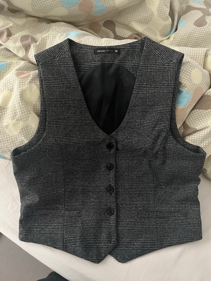 Düğmeli ve kolsuz, oturan kesime sahip gri ekose desenli kadın yeleği. Sentetik kumaştan, normal boyda, günlük ve iş stiline uygun. 1 2 kez giyildi bir kusuru yok