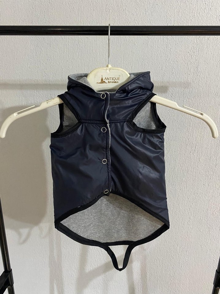 Düğmeli ön kısmı ve kolsuz tasarımıyla gri köpek street wear kıyafeti, pürüzsüz kumaştan üretilmiştir. Stil için kapüşonlu.