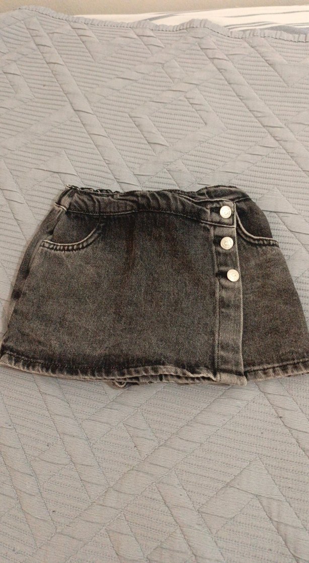 Gri kot kumaştan, düğmeli ve bol kesim olan bu etek, sokak modasına uygun sade tasarıma sahiptir.