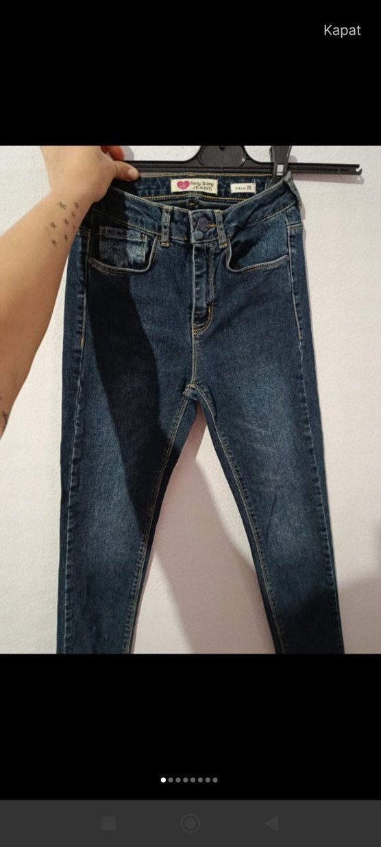 Düğmeli ve bağlama desenli, gri-mavi tonlarında kadın jean. Denim kumaştan, günlük sokak stiline uygun, dar kesim bir model.