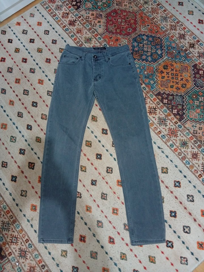 Düğmeli, gri-mavi batik desenli, normal boy, regular fit erkek kot pantolon, dayanıklı denim kumaştan üretilmiştir.