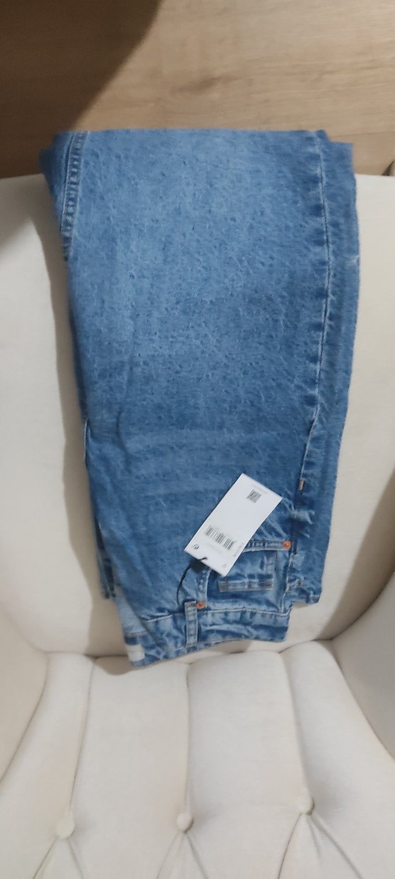 Düğmeli, bol kesim kadın kot pantolon, gri-mavi batik desenlidir. Midi boyda, günlük kullanıma uygundur.