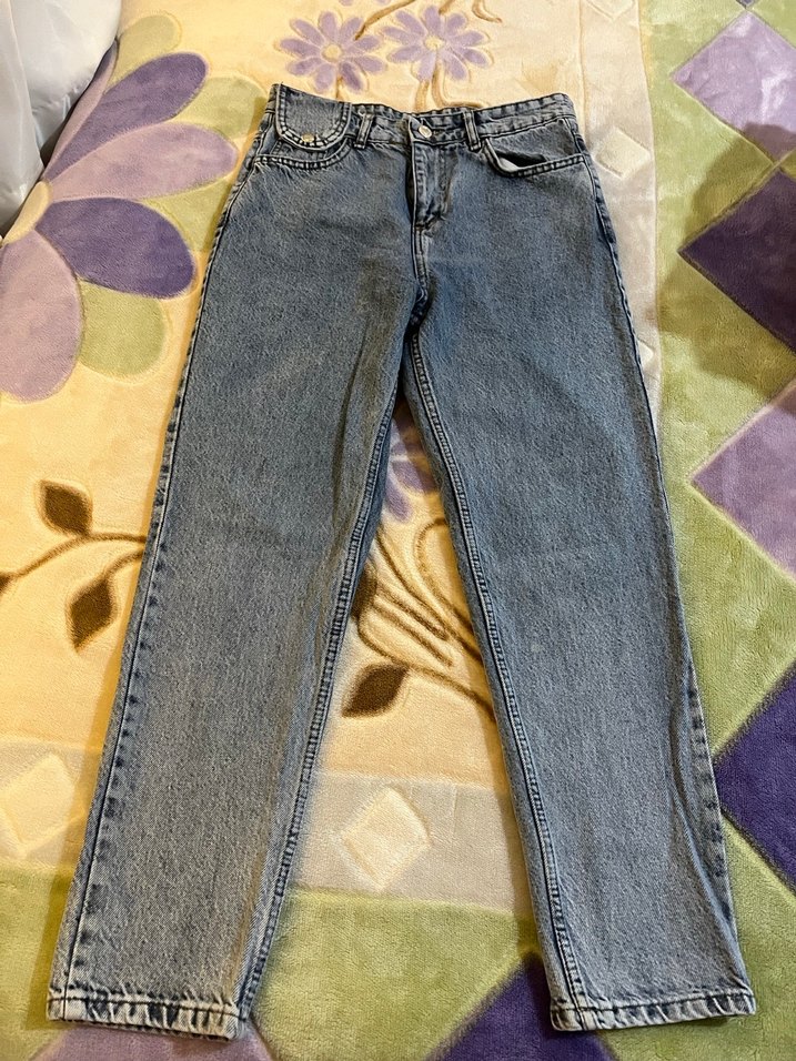 Günlük kullanıma uygun, düğmeli, bol kesim, normal boy, gri-mavi tonlarında kadın kot pantolon. Hafif batik desenlidir.
