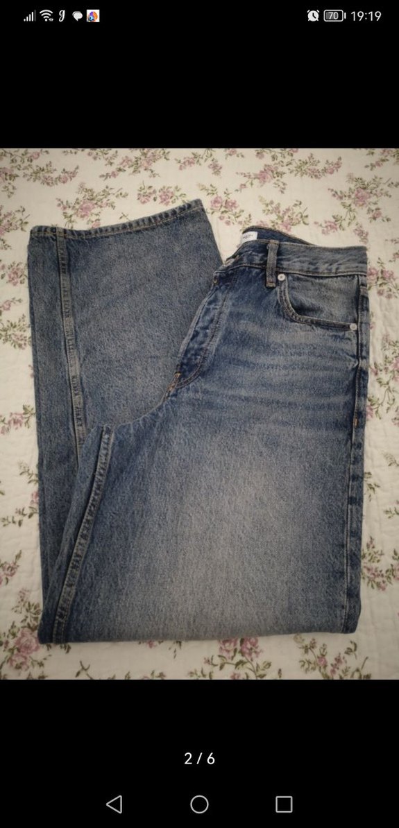 Düğmeli, bol kesim, gri-mavi tonlarda yumuşak denimden yapılmış kadın jean. Normal midi boy, vintage normcore tarzında, günlük rahat kullanım için uygundur.