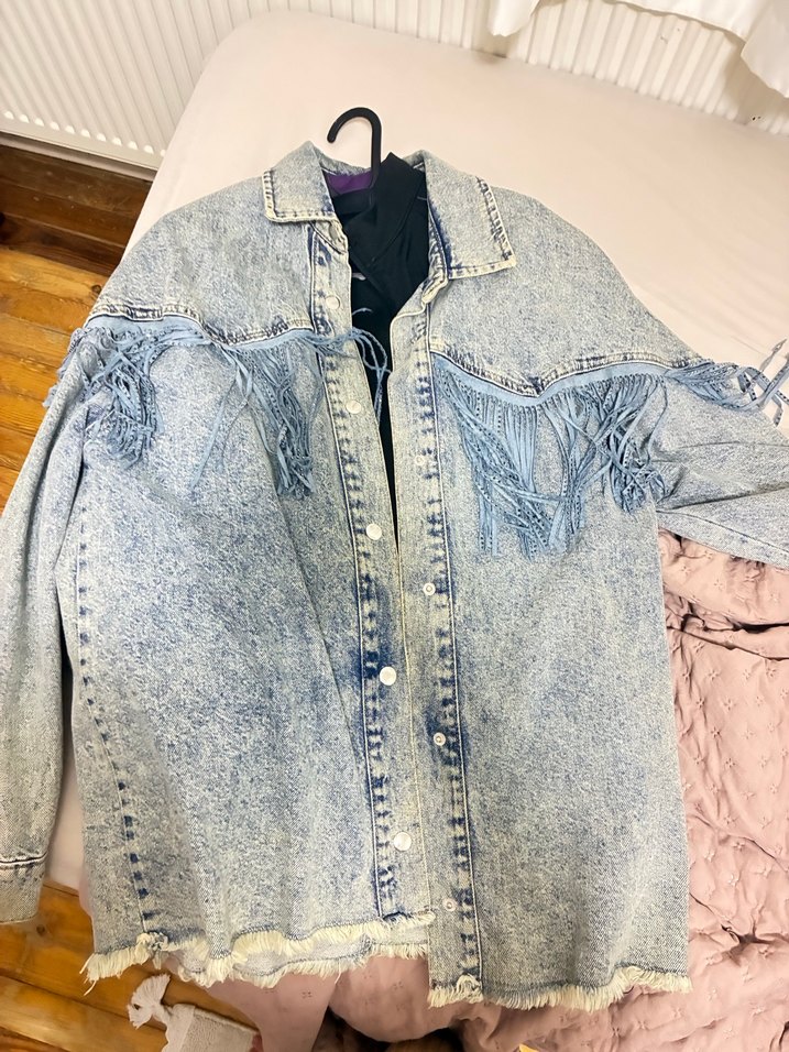 Bu bol kesim denim ceket düğmeli, uzun kollu ve kesik yakalıdır. Püskül detaylarıyla günlük sokak stiline uygundur, midi boyda rahat bir parçadır.