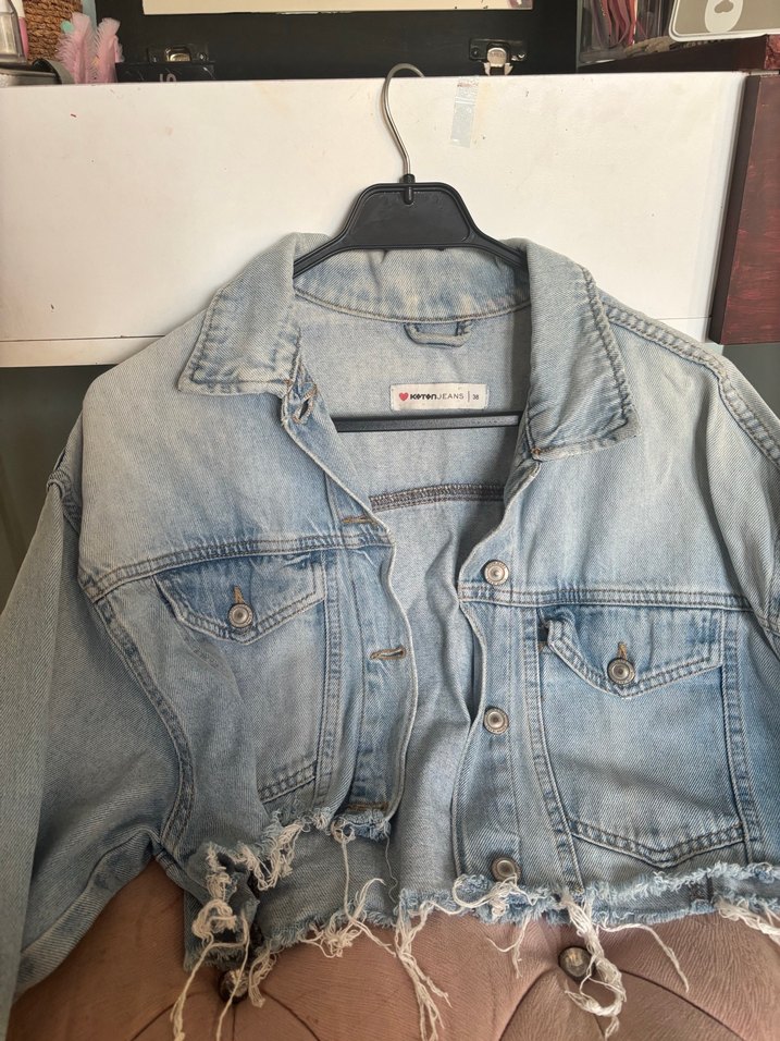 Düğmeli ve notalı yaka detaylı, bol kesim gri-mavi denim ceket. Normal boy, askılı kollu, gündelik şık tarzda, yıpranmış etek ucu detaylı.