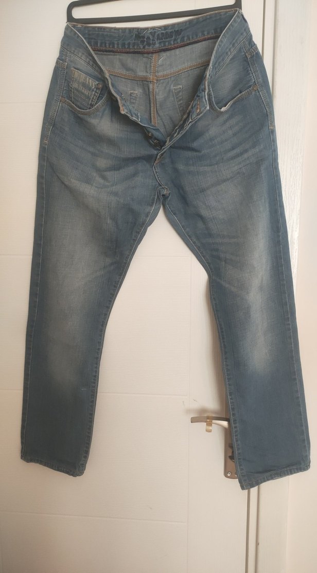 Düğmeli, normal boy, regular kesim gri mavi denim erkek pantolon, günlük sokak stili için uygun.yards 30/32