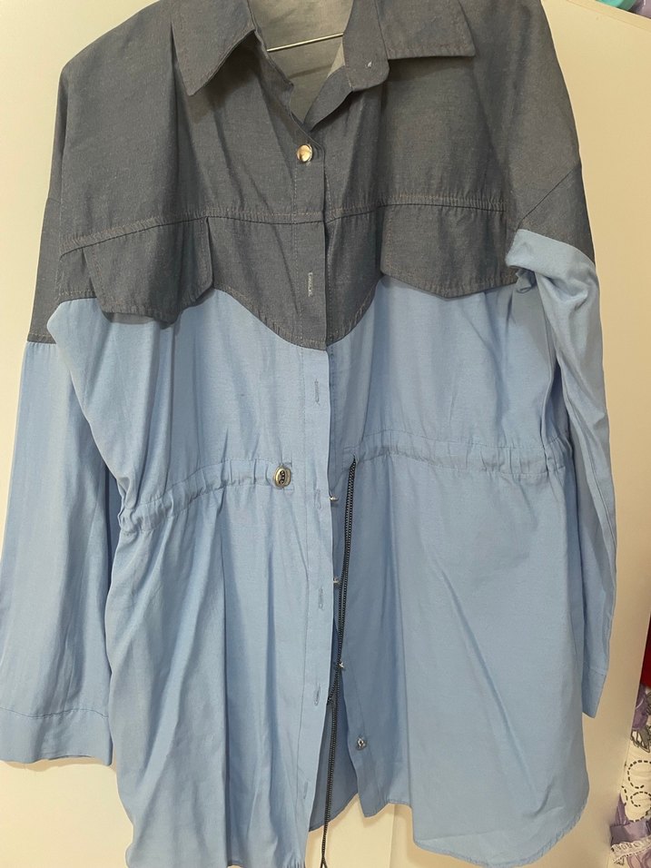 Gri ve mavi tonlarda, düğmeli, yakalı, uzun kollu, midi boy bol kesim Günlük kullanıma uygundur. Minik bir lekesi var görselde belirtildi
