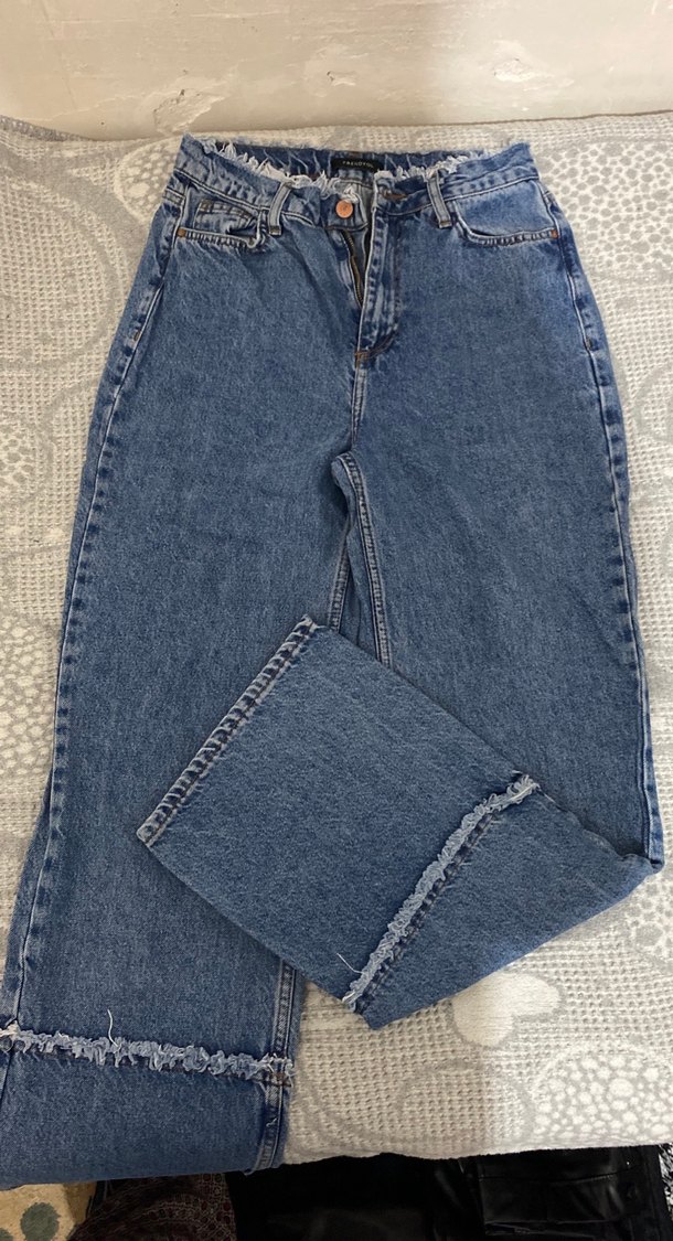 Düğmeli ön kapağı ve yırtık detaylı kenarlarıyla bol kesim midi uzunlukta gri-mavi kot pantolon.