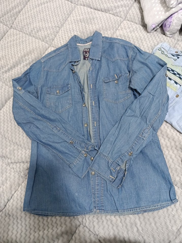 Gri-mavi renkte, düğmeli ön ve kesik yakalı, uzun kollu bol kesim denim ceket, rahat sokak stiline uygun.