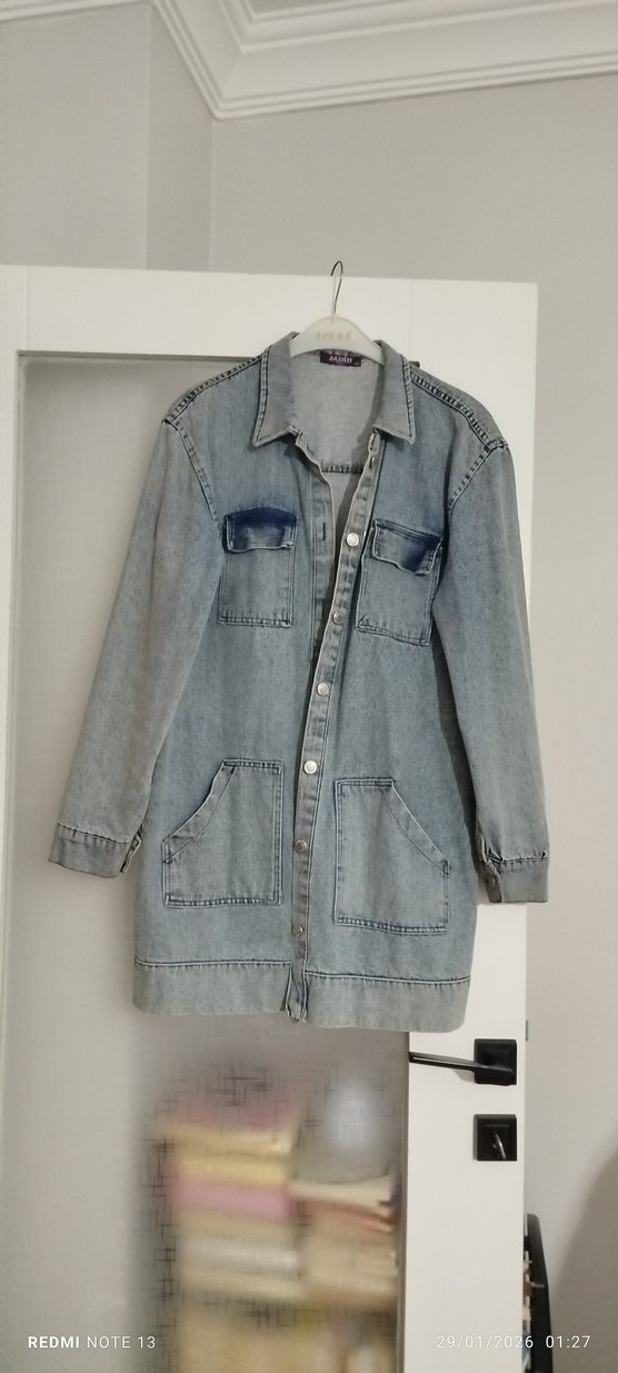 Düğmeli, bol kesim, çıtçıtlı uzun kollu kadın denim ceket. Notlu yakalı, cep detaylı, gri mavi tonlarında midi uzunlukta rahat bir model.