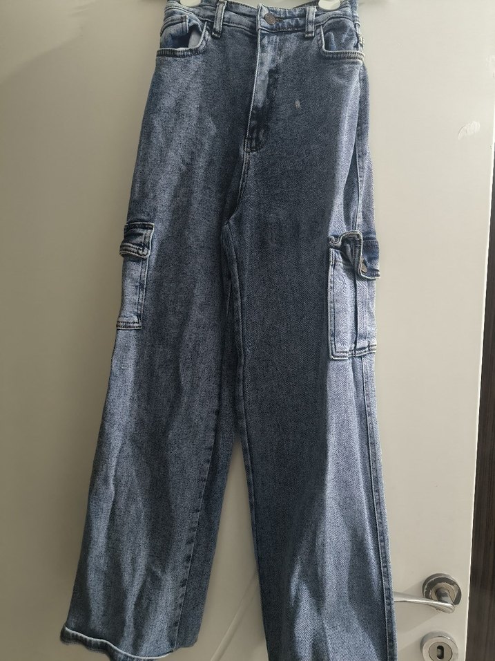 Düğmeli, bol kesim gri-mavi renk kadın denim pantolon. Midi boyda, sokak stili için uygun, günlük kullanıma ideal.