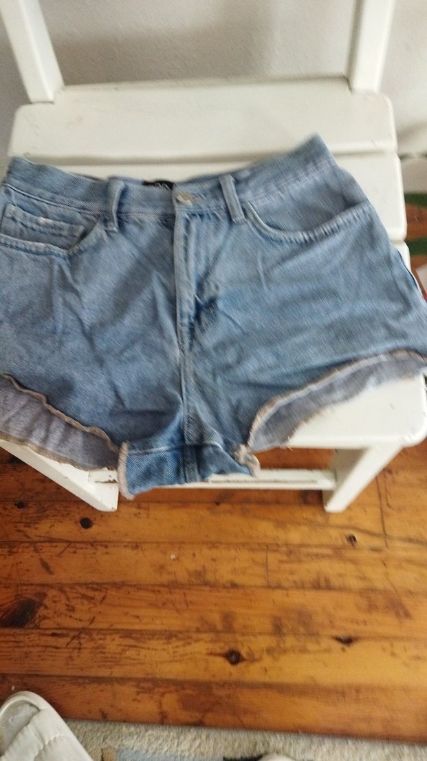 Gri-mavi renk düğmeli, bol kesim kadın denim şort. Kısa boy, günlük ve sokak modasına uygun rahat stil.