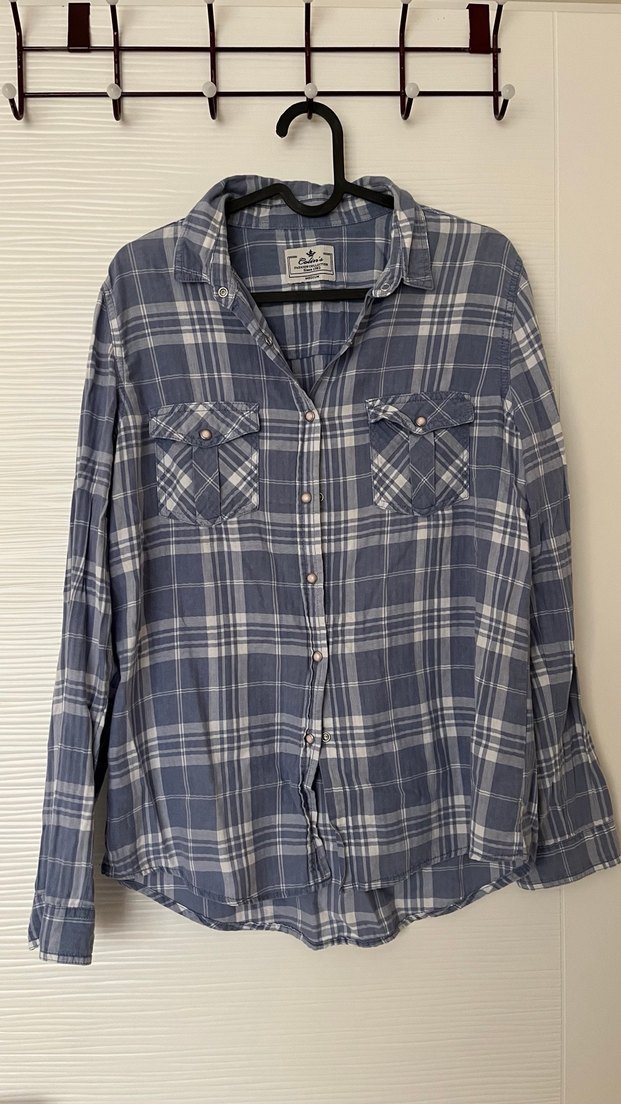 Kadın gömlek, düğmeli ön, uzun kollu ve yaka detayına sahiptir. Pamuk kumaştan, bol kesim ve normal boyda, gri mavi kareli desende, günlük sokak modası için uygundur.