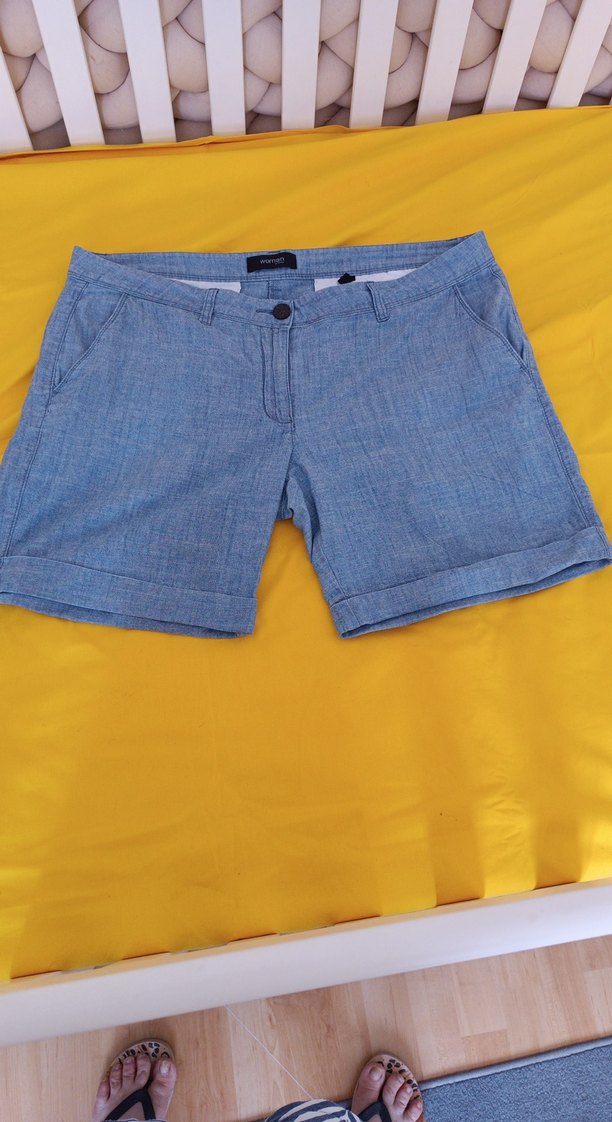 Gri denim görünümlü keten kumaştan, düğmeli arka cepli, rahat kesim kadın mini şort. Günlük kullanıma uygun, rahat ve şık sokak stili şort.