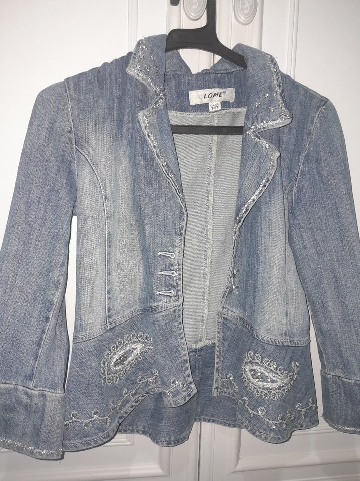Düğmeli, uzun kollu, cepli ve gri-mavi tonlarında rahat kesim kız çocuk taşlı ceket 8 9 yaş için uygundur.