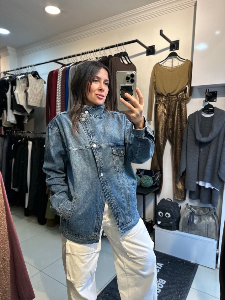 Düğmeli ön kısmı, uzun kollu, yüksek yakalı, bol kesim kot ceket. Gri-mavi ceket, sokak stili ve günlük kullanım için uygundur. Orijinaldir ithal üründür Marka temsilidir