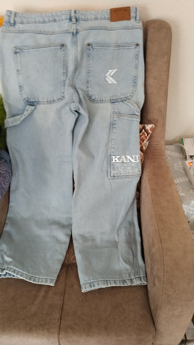 Düğmeli ve cepli, gri-mavi tonlarında loose fit kot pantolon. Günlük kullanıma uygun, KAN nakış detaylı.