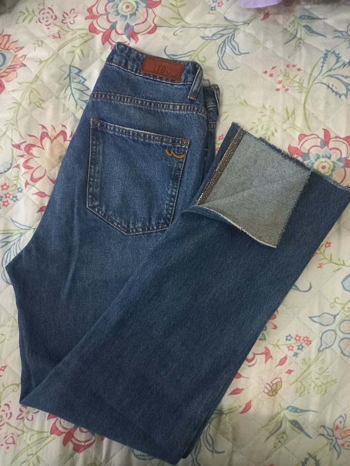 Gri tonlarında mavi kot pantolon, düğmeli ve midi boyda, rahat kesim. Günlük kullanıma uygun, desensiz sade tarzda.