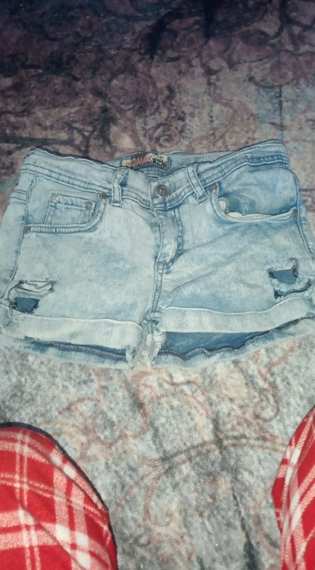 Gri-mavi tie-dye desenli, düğmeli ve yırtık detaylı bol kesim mini denim şort, rahat ve sokak stiline uygun.