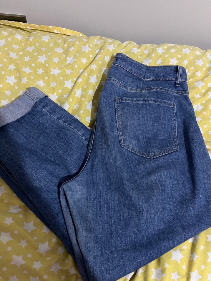 Düğmeli, gri tonlarında mavi renkte, rahat kesim kadın kot pantolon. Midi boy, günlük kullanıma uygun normcore tarzda.