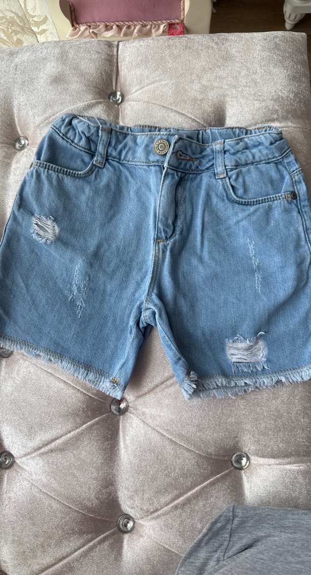 Salaş kesim, düğmeli gri mavi kız kot şort, yıpratma detaylarıyla dikkat çeker.