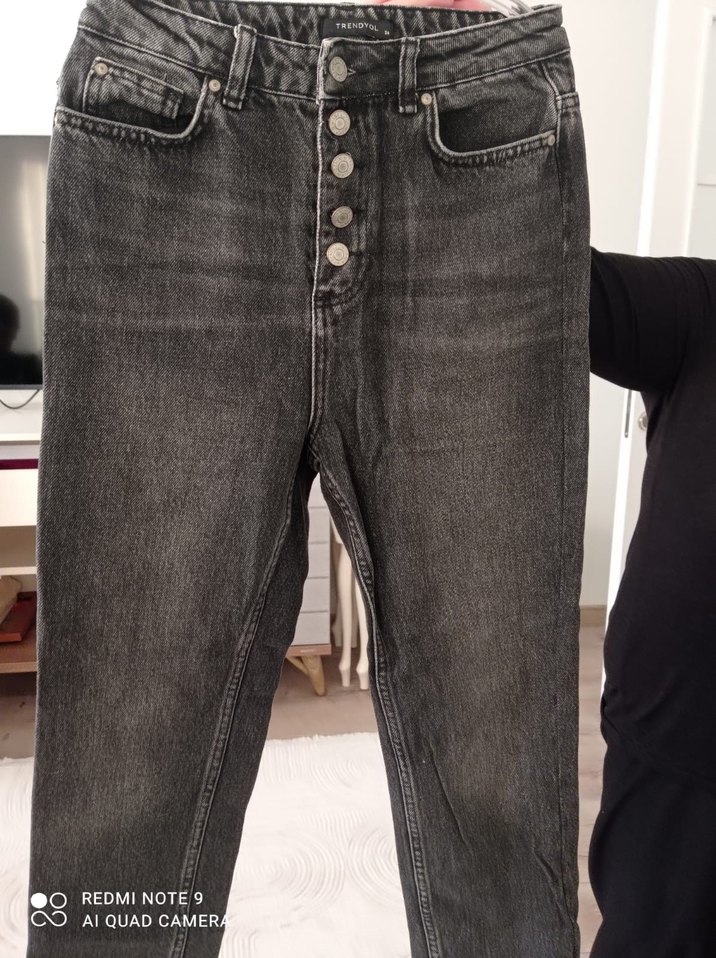 Düğmeli kapamalı, midi boy, bol kesim gri kot pantolon. Günlük kullanıma uygun, desen içermeyen ve rahat bir sokak stili sunar.