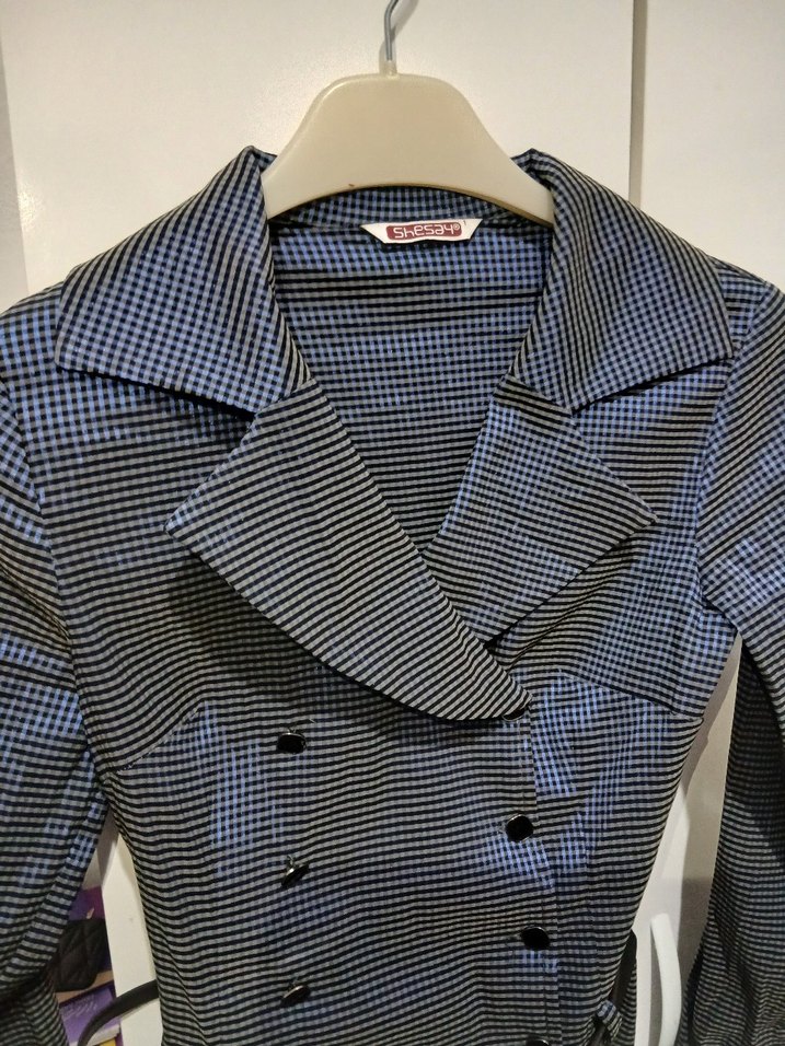 Düğmeli önü, notalı yaka ve uzun kollu gri midi hamile ceketi. Sentetik kumaştan, baskılı desene sahip, ofis için uygun.