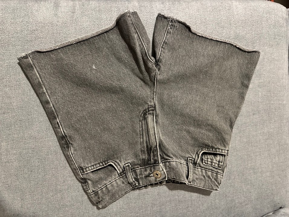 Düğmeli, gri midi denim şort, bol kesim ve rahat sokak stiliyle günlük kullanıma uygun,.