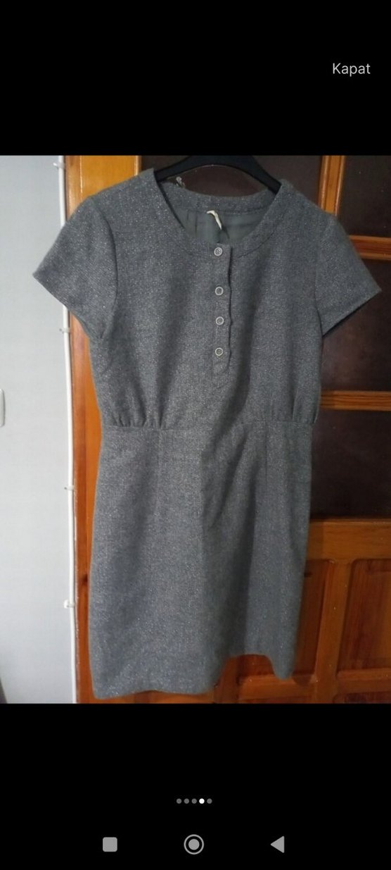 Düğmeli ön kısmı, kısa kollu ve yuvarlak yakalı bu hamile elbisesi, yumuşak yün kumaştan yapılmıştır. Ofis için uygun, sade ve düz tasarımlıdır.