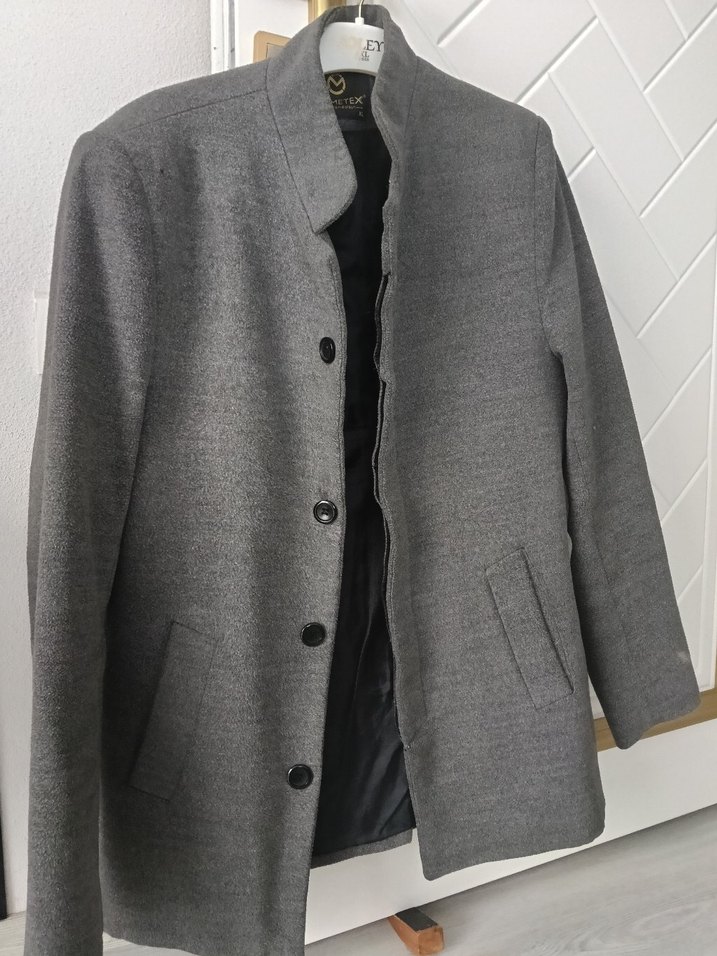 Gri yün kaban, düğmeli kapama, uzun kollu ve notched yaka detayına sahiptir. Normal kesim, midi boy ve desensiz tasarıma sahiptir, ofis için uygundur.