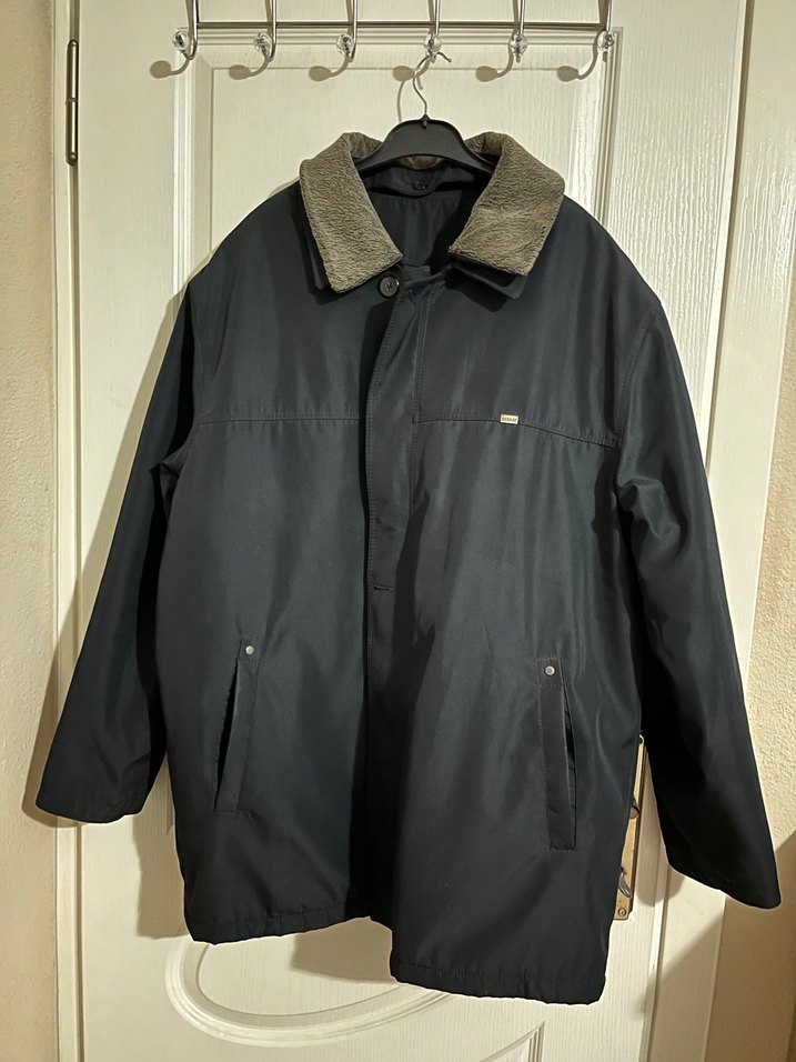 Düğmeli, çentikli yakalı erkek kaban. Uzun kollu, normal kesim ve yumuşak kumaştan, koyu gri renktedir. Ofis için uygundur. İç astarı ve yaka kısmı fermuarlı çıkarılabilir. Sadece ön ceplerin astarında yırtık vardır.