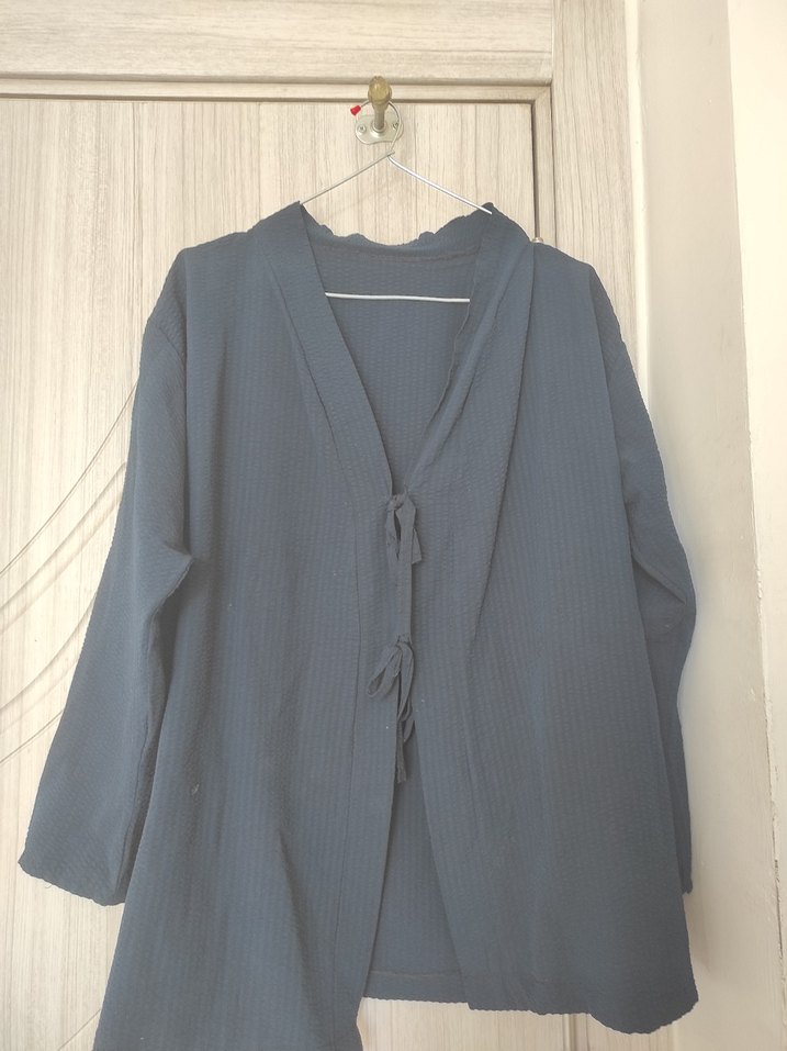 Düğmeli, uzun kollu, gri midi hamile ceketi. Keten kumaştan, bol kesim ve yakası notch detaylıdır.