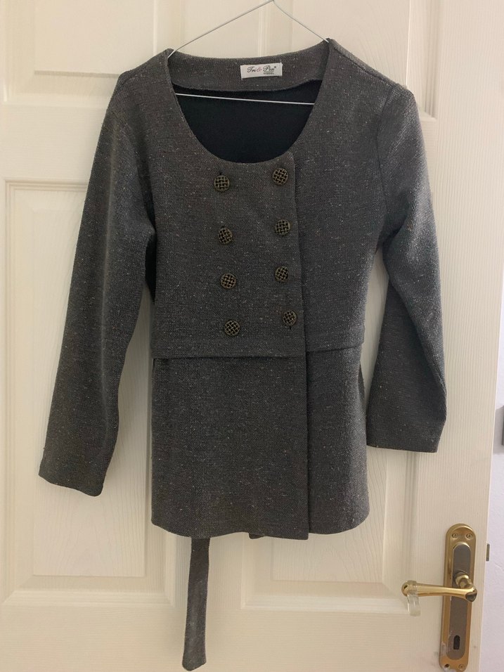 Gri hırka , düğmeli ön kısmı ve kesimli siluetiyle dikkat çeker. Uzun kollu ve midi boydadır,