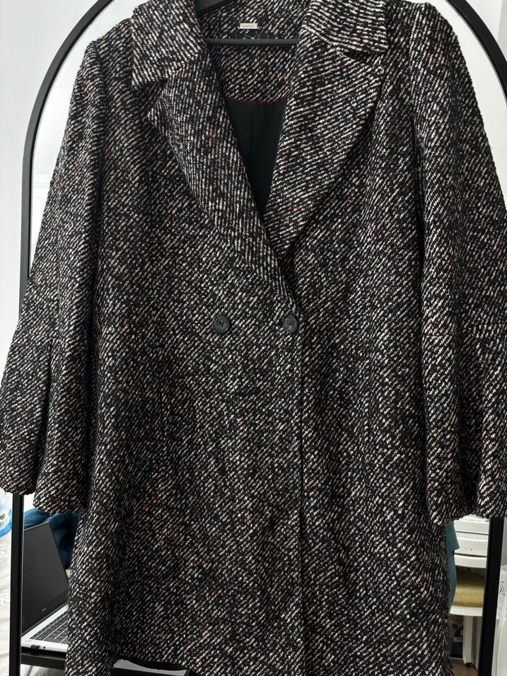 Düğmeli, yaka detaylı gri kaban. Yün kumaştan, uzun kollu ve rahat kesim. Ofis için uygun, desenli midi boy.