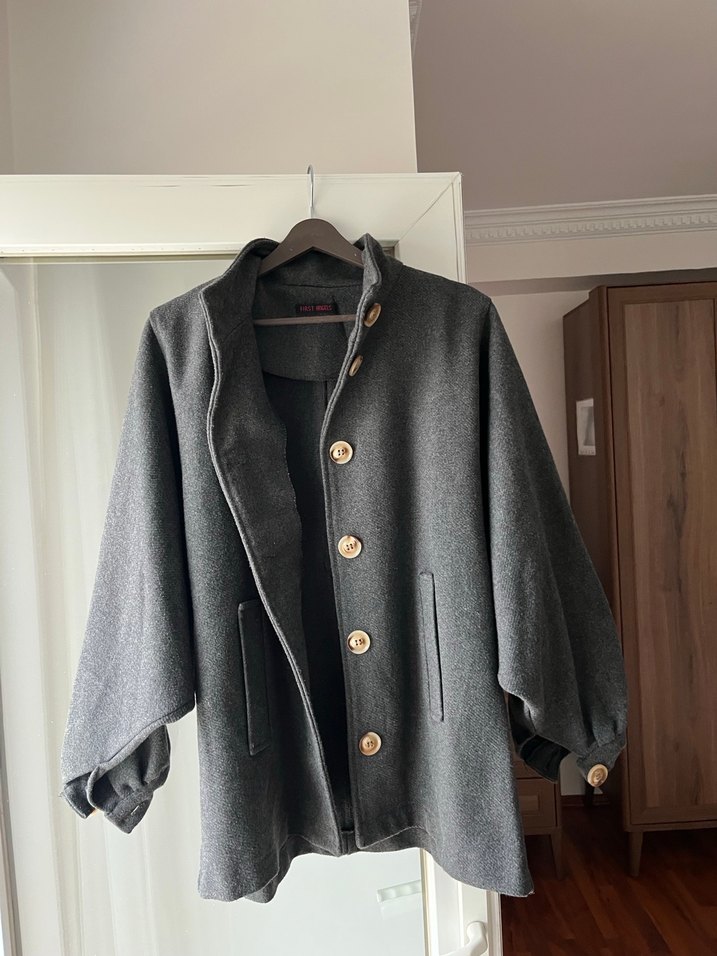 Gri renkte, düğmeli ve notched yakalı kabanı, uzun kollu ve bol kesimdir. Yumuşak dokusu günlük kullanıma uygundur.