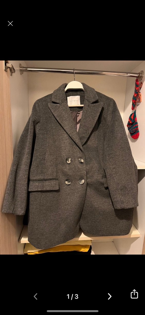 Gri yün kumaştan, düğmeli, normal kesim ve midi boyda, uzun kollu, ofis ve günlük kullanıma uygun kadın blazer ceket.
