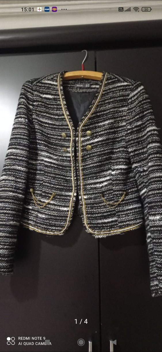 Düğmeli, gri tonlarda tüvit kumaştan üretilmiş, kesimli ve midi uzunlukta kadın ceketi. Uzun kollu, ofis ve günlük kullanıma uygun, cepler ve kenarlarda altın detaylar bulunur.