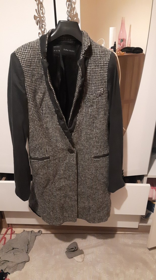Düğmeli ön kısmı ve etek boyu midi olan bu kadın ceketi, gri desenli gövde ve düz uzun kollara sahiptir. Ofis için uygun, rahat kesim ve sentetik kumaştan üretilmiştir. boy 85 iki kol arası 47 santim
