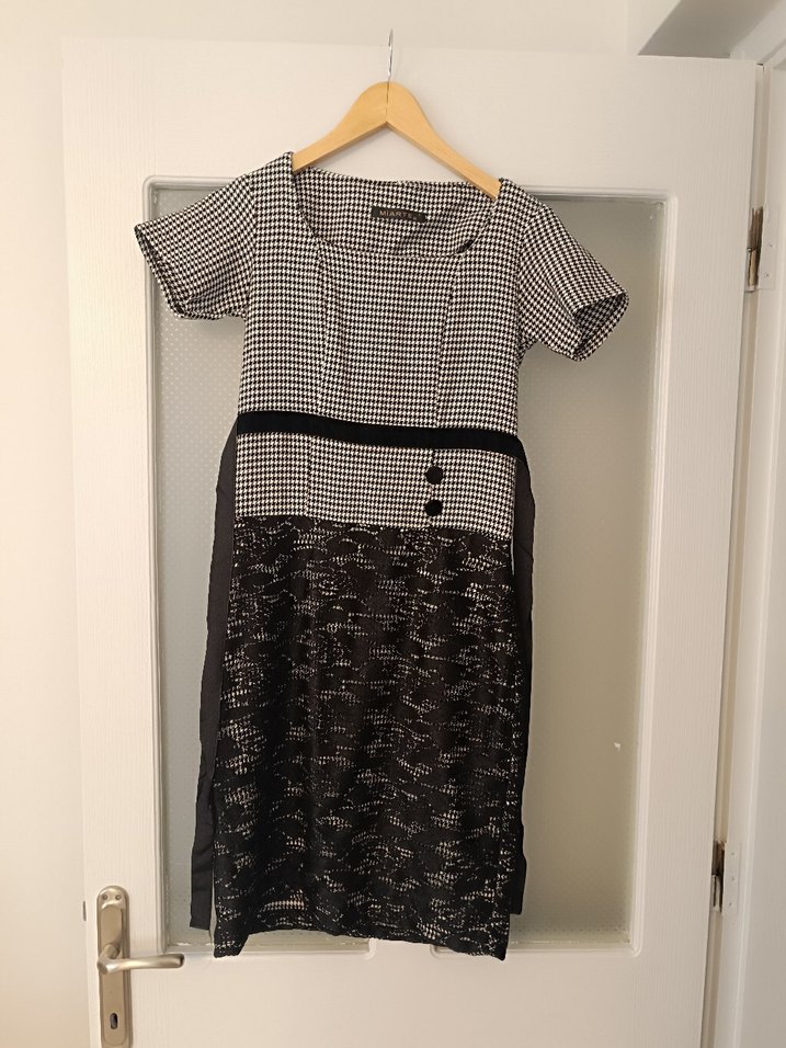 Gri midi elbise, tekne yakalı ve kısa kolludur. Düğmeli detay ve farklı tekstil desenleriyle günlük şıklık sunar. boy 90 göğüs 40 .