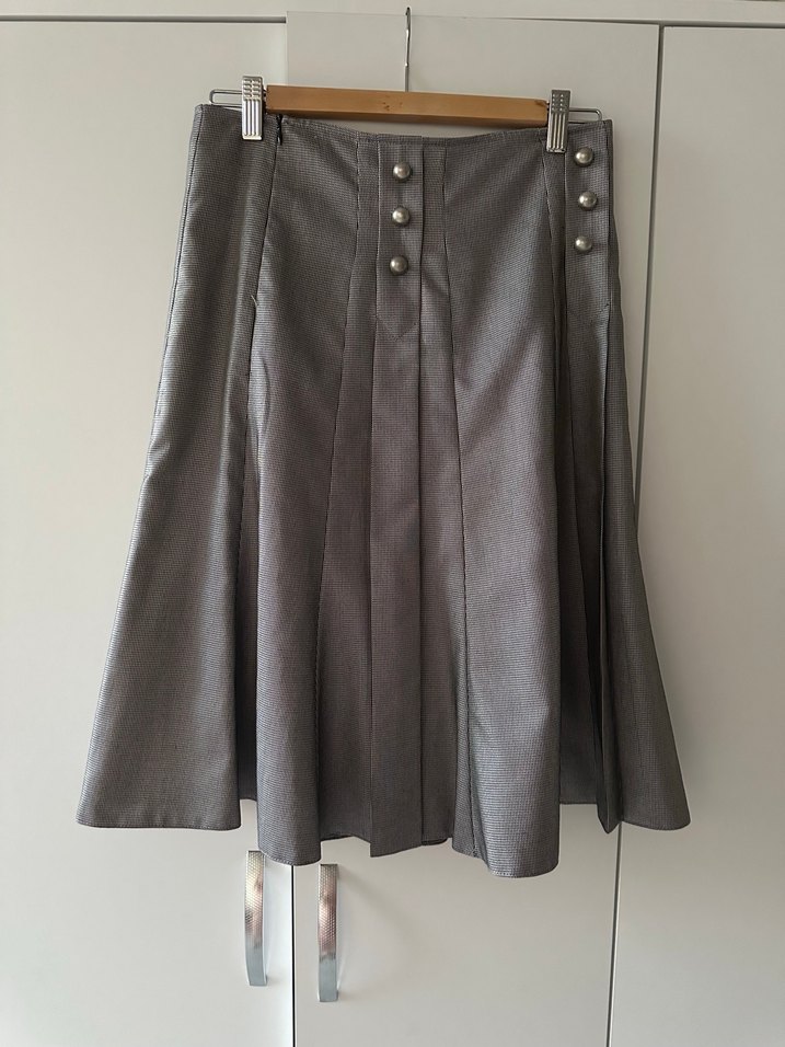 Düğmeli detaylara sahip gri midi etek, düz kesimi ve sentetik yumuşak kumaşıyla ofis stiline uygun goth tarzını yansıtıyor.