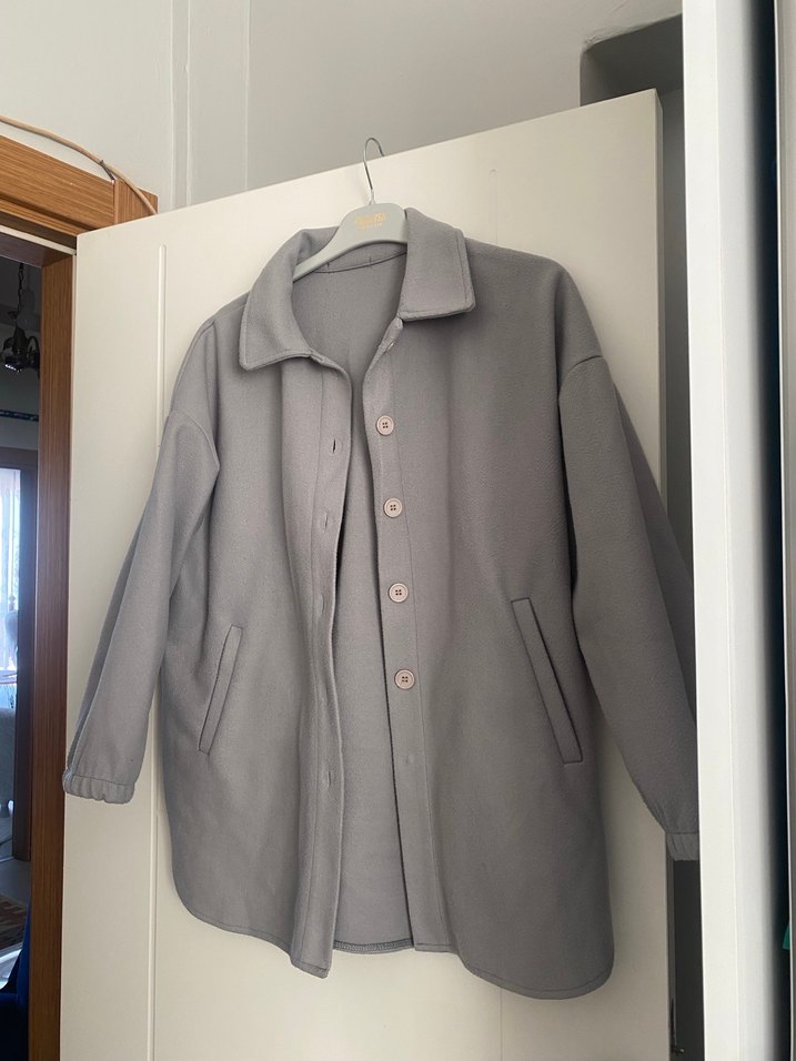 Gri midi uzunlukta kadın kaban, düğmeli ve kesik yaka detayıyla öne çıkar. Uzun kollu ve rahat kesimdir, yumuşak ve sıcak kumaştan yapılmıştır.