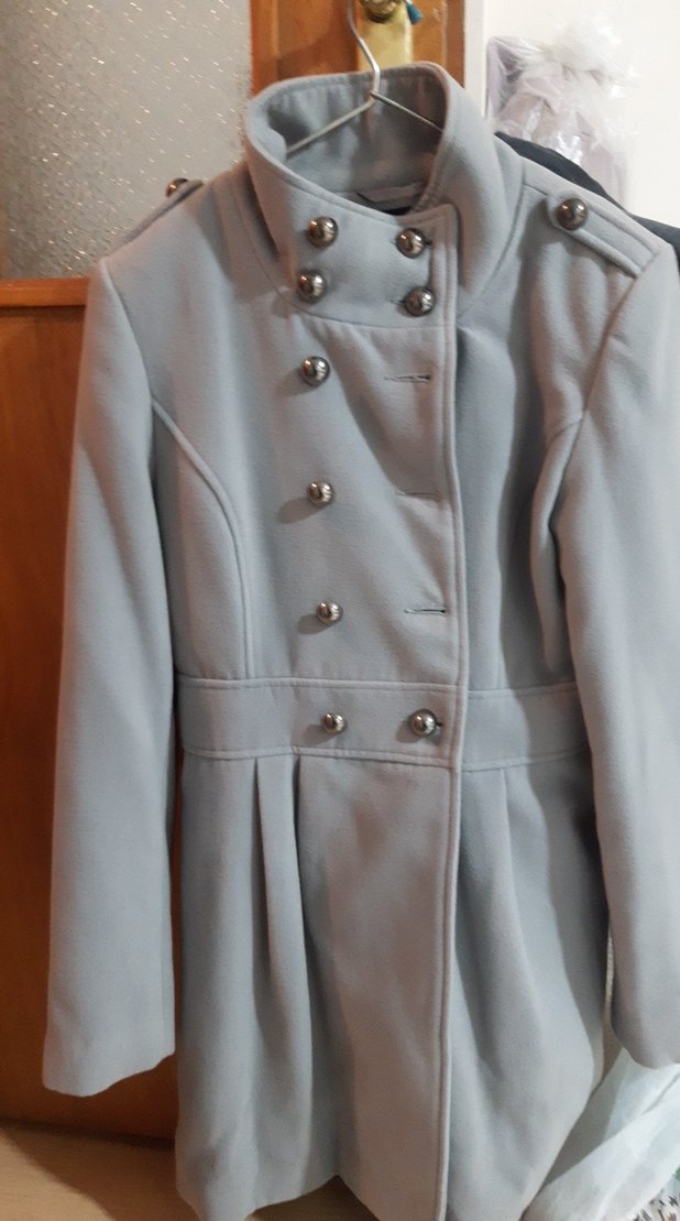 Düğmeli, uzun kollu, klasik Paris tarzı gri midi boy kadın kaban. Yumuşak ve sıcak kumaştan, günlük kullanıma uygun şık kesim.