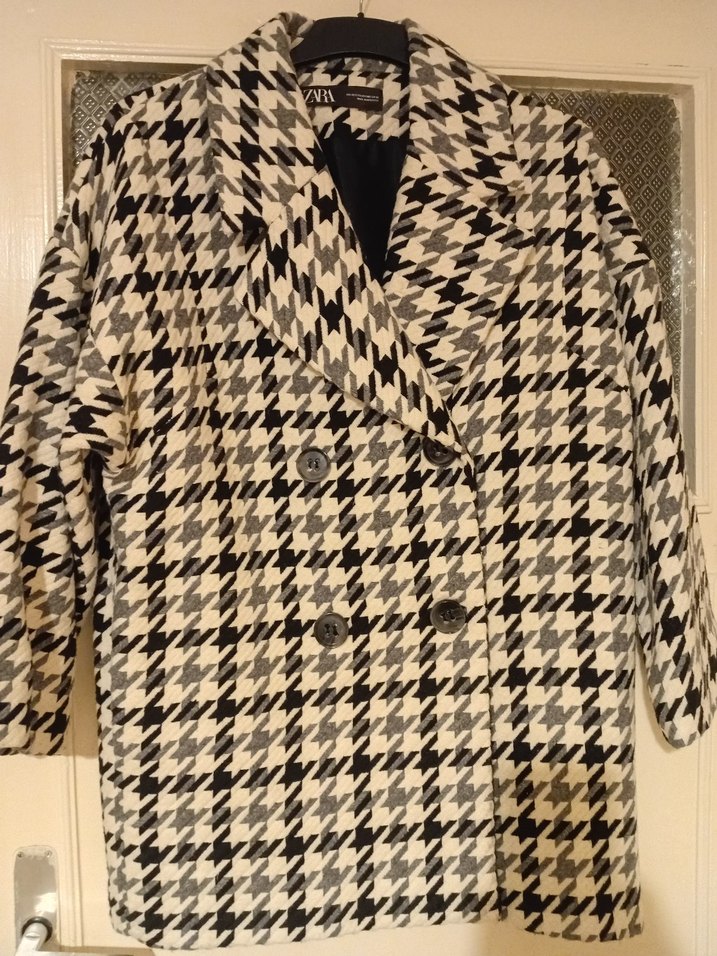 Kadınlar için düğmeli, yaka detaylı gri midi kaban. Uzun kollu, normal kesim, yün kumaş ve klasik kazayağı desenlidir. Ofis için uygundur.