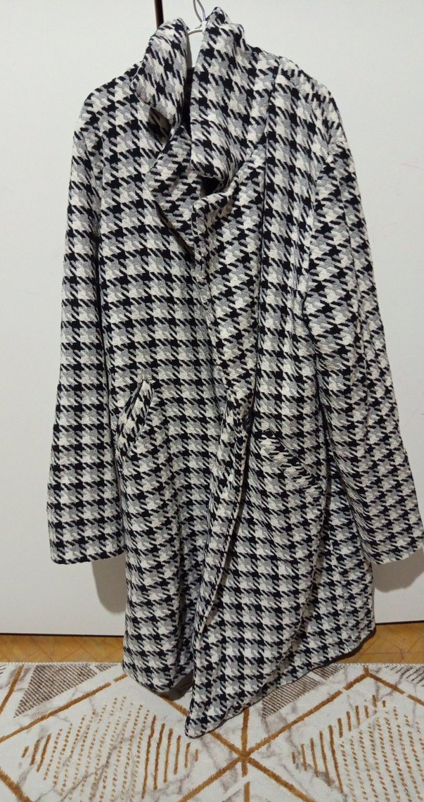 Düğmeli, yumuşak sentetik kumaştan yapılmış, notalı yaka kadın kaban. Salaş kesim ve uzun kollu, günlük ve sokak stili için uygundur.