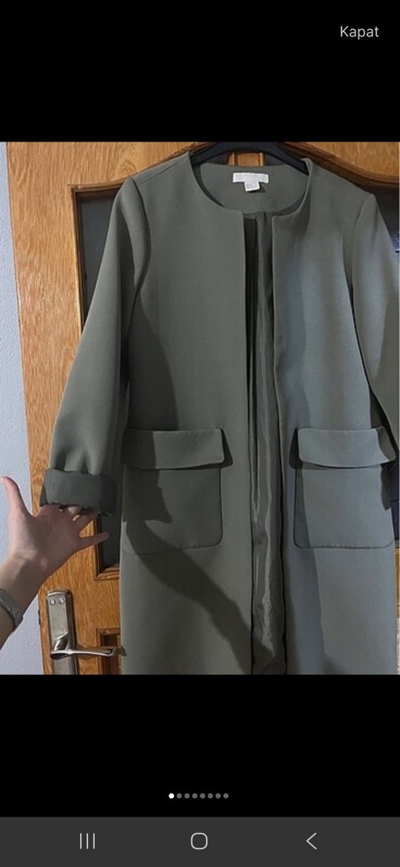 Gri midi kaban, düğmeli ve uzun kolludur. Sentetik kumaştan yapılmış, iş ve sokak stiline uygun, cepli ve regular fit modeldir.