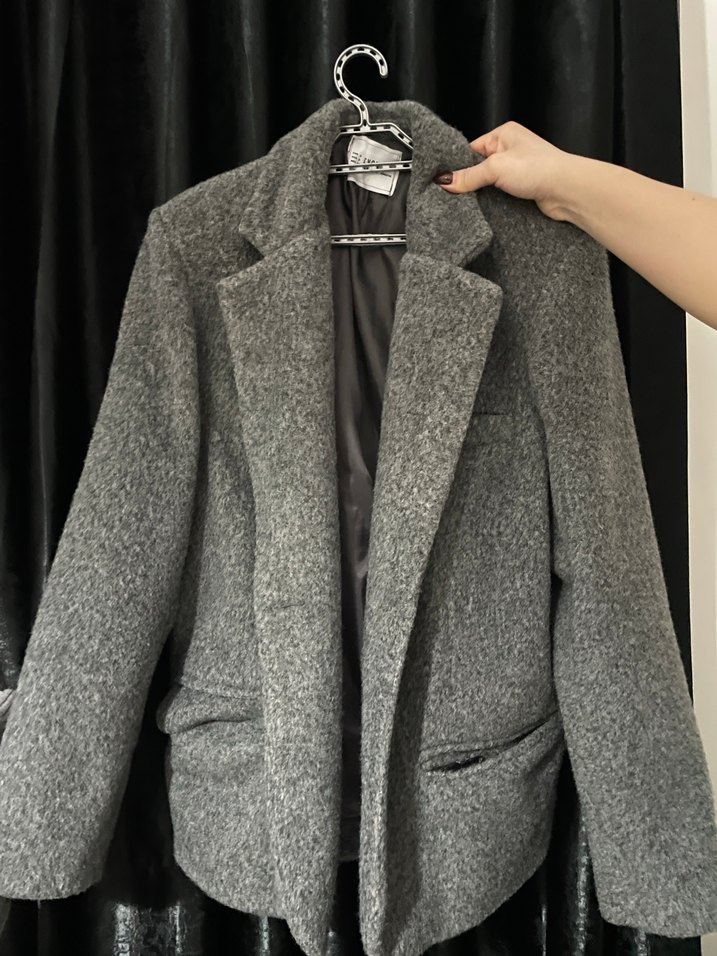 Gri renkli, yün kumaştan düğmeli, normal kesim ve uzun kollu, ofis için uygun midi uzunlukta kaban.