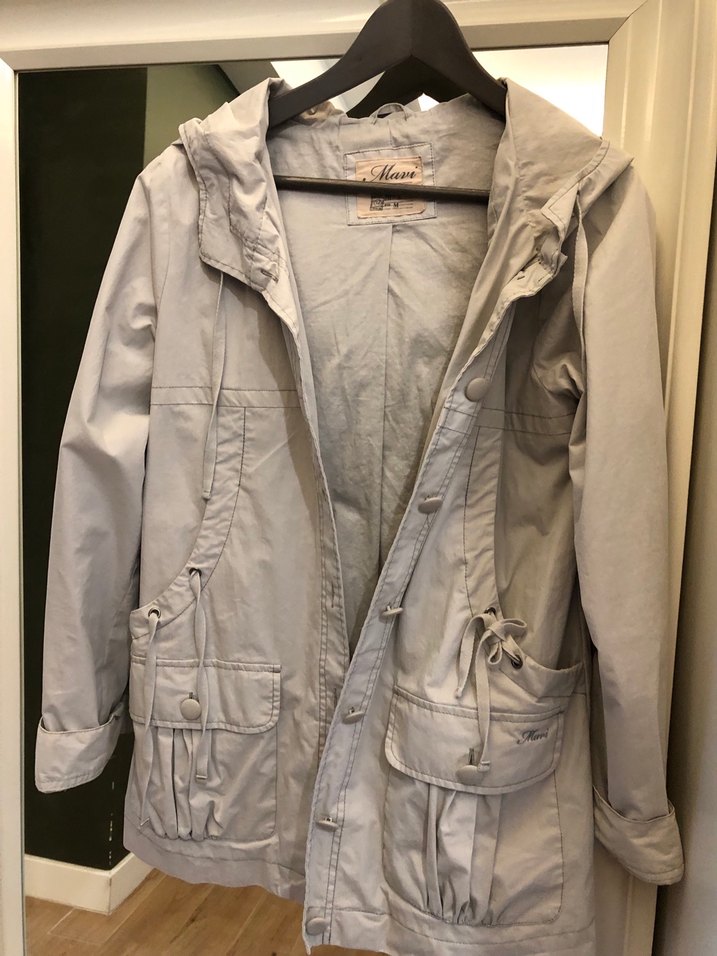 Gri keten ceket, düğmeli ön, kesik yaka ve uzun kolludur. Salaş kesim ve midi boy ile günlük rahat kullanıma uygundur.