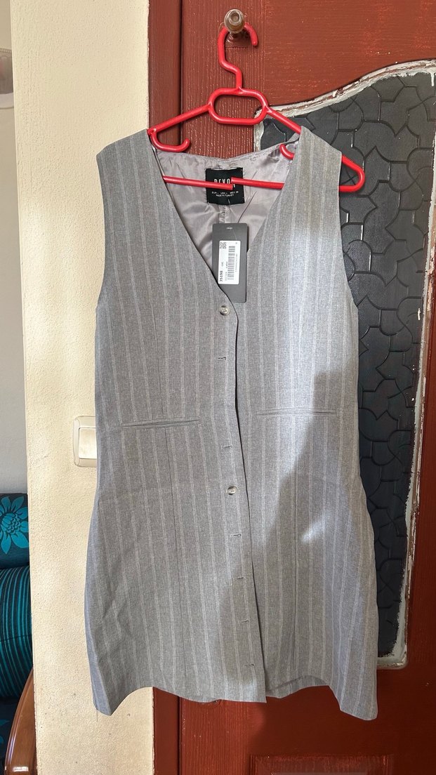 Düğmeli, kırlangıç yaka, kolsuz gri midi yelek. Düz sentetik kumaştan, ofis kullanımı için uygun, regular fit. Çok şık bir elbise ofis için harika heryere giyilir altına spor ayakkabı da gider topukluda