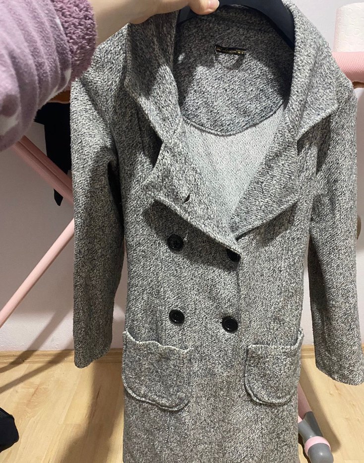Gri yün kaban, düğmeli ve kesik yaka detaylıdır. Uzun kollu, midi boy ve vücuda oturan kesimiyle sokak stiline uygundur.